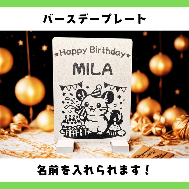 かわいいチンチラが誕生日をお祝い! お名前を入れられる、特別なバースデープレートです。 誕生日の記念やギフトにもぴったり。 軽くて飾りやすいので、ケージの近くやお部屋のインテリアにも◎ 【仕様】 ・サイズ:約 12cm × 16cm × 厚み1.4mm ・素材:PLA+ 【ご注文方法】 ご希望のお名前(アルファベット大文字)を備考欄にご記入ください。 【注意事項】 ・3Dプリンター製のため、若干の印刷ムラが見られる場合があります。 ・お名前の文字数により、文字サイズを調整する場合がございます。 ・本商品は受注生産のため、返品はお受けできません。 ・発送までに数日お時間をいただく場合がございます。